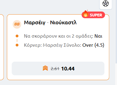 Προγνωστικό:Περιμένω ωραίο παιχνίδι. Και οι δύο ομάδες έχουν πολύ καλές επιθετικές γραμμές εξ ου και το G/G είναι καλή επιλογή. Ωστόσο, η Μαρσέιγ θα πιέσει και η ενισχυμένη απόδοση που βρήκαμε στην Winmasters, με τα γκολ εκατέρωθεν και το Over 4,5 κόρνερ των γηπεδούχων άνω του δεκαπλασιασμού, δεν θα περάσει απαρατήρητη. Μικρό βέβαια ποντάρισμα.