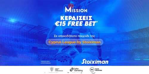 Το κείμενο που ακολουθεί είναι πληρωμένη διαφήμιση εκ μέρους της Stoiximan Cyprus | 18+ | Παιχνίδι είναι, θέλει όρια | ...Stoiximan Mission με €15 Free Bet σε οποιοδήποτε αγώνα της Cyprus League by Stoiximan